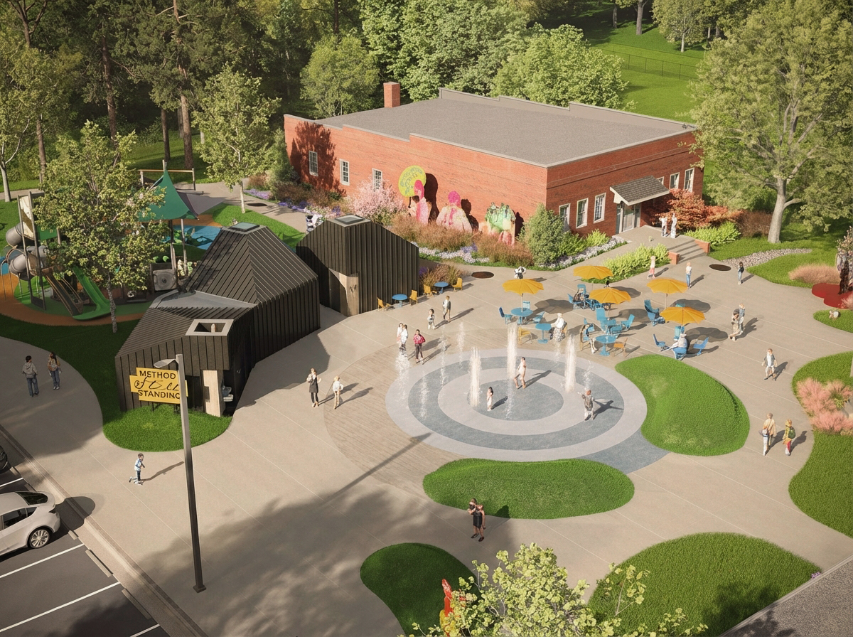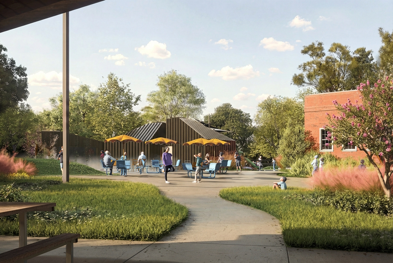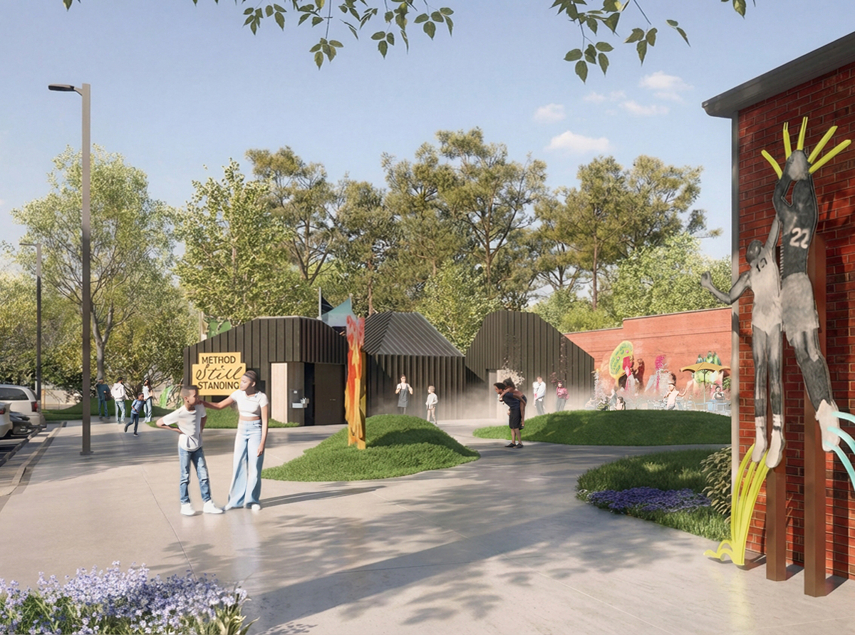 Outside is the centerpiece of the project: a new central plaza with a splash pad and playground, located between the Community Center and the Pioneers Building. Serving as a connection point to the built structures and athletic courts and fields, the plaza will serve as a primary gathering space for class reunions, drum circles, and other formal and informal events. The plaza and park will feature installations by local artist Dare Coulter, who is creating multiple large-scale, sheet metal and bronze sculpture pieces with imagery and graphics from the school yearbooks and newspapers. She is also creating metal medallions of similar imagery to be cast into the sidewalks encompassing the plaza. The Berry O’Kelly Obelisk monument, erected in 1986 by alumni and friends of the school to honor O’Kelly, will be relocated to the new plaza. Adjacent to the splash pad will be a new amenity building, housing outdoor restrooms and a pump house in support of the splash pad. Site wide, the project will provide enhanced ADA connectivity to the buildings, parking, amenities, and the Method community. New features, such as EV charging stations, will give the community access to a growing and in-demand technology.