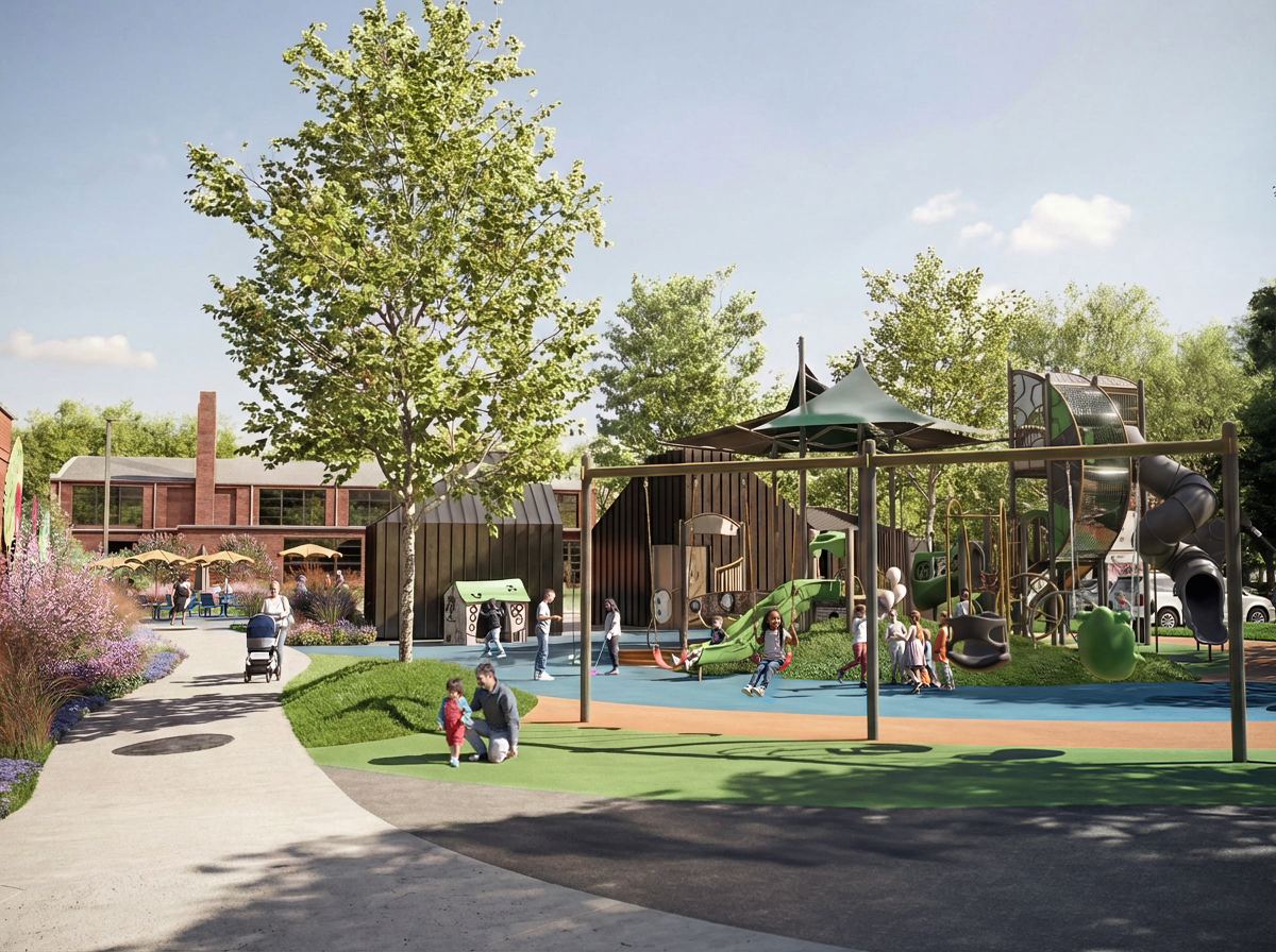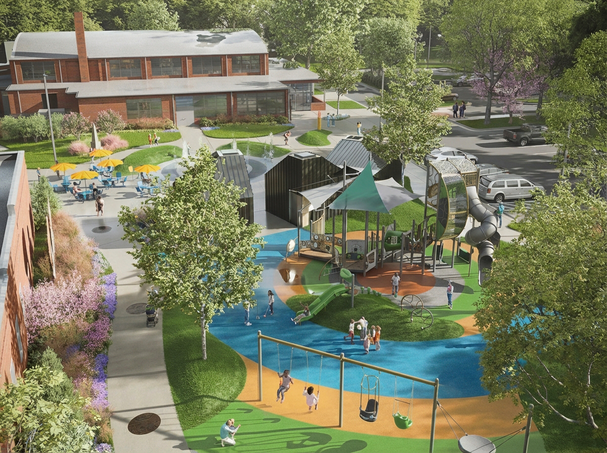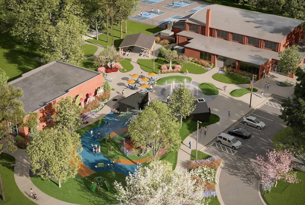 Outside is the centerpiece of the project: a new central plaza with a splash pad and playground, located between the Community Center and the Pioneers Building. Serving as a connection point to the built structures and athletic courts and fields, the plaza will serve as a primary gathering space for class reunions, drum circles, and other formal and informal events. The plaza and park will feature installations by local artist Dare Coulter, who is creating multiple large-scale, sheet metal and bronze sculpture pieces with imagery and graphics from the school yearbooks and newspapers. She is also creating metal medallions of similar imagery to be cast into the sidewalks encompassing the plaza. The Berry O’Kelly Obelisk monument, erected in 1986 by alumni and friends of the school to honor O’Kelly, will be relocated to the new plaza. Adjacent to the splash pad will be a new amenity building, housing outdoor restrooms and a pump house in support of the splash pad. Site wide, the project will provide enhanced ADA connectivity to the buildings, parking, amenities, and the Method community. New features, such as EV charging stations, will give the community access to a growing and in-demand technology.