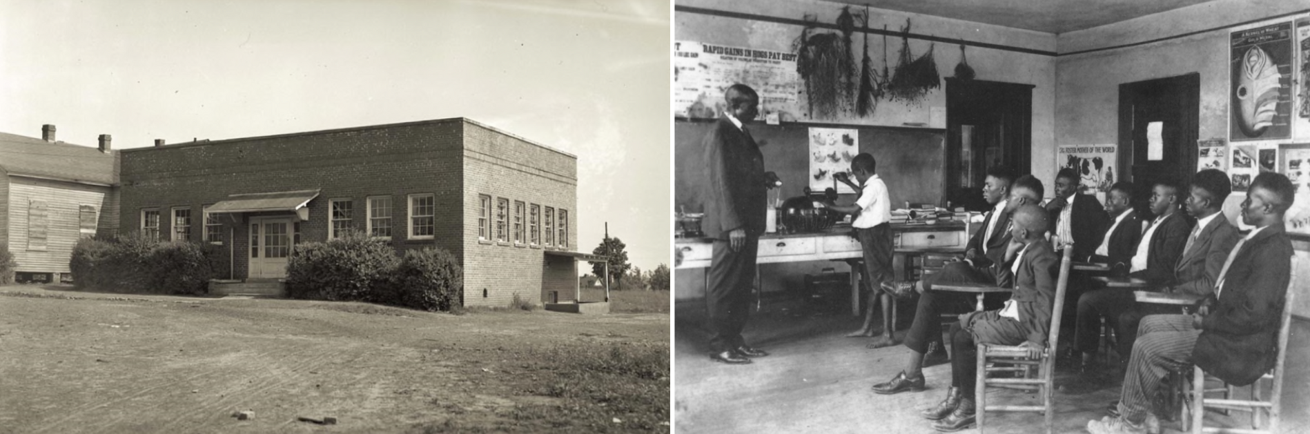 Left, the Agricultural Building of the Berry O’Kelly School, later renamed the Pioneers Building. Right, students learning at the Agricultural Building of the Berry O’Kelly School, date unknown. Courtesy, State Archives of North Carolina, left, and the City of Raleigh Museum, right.