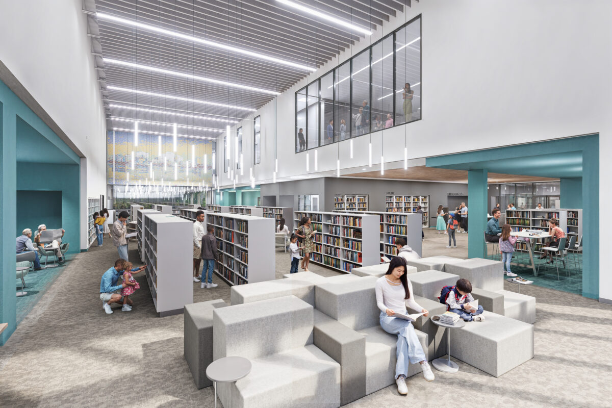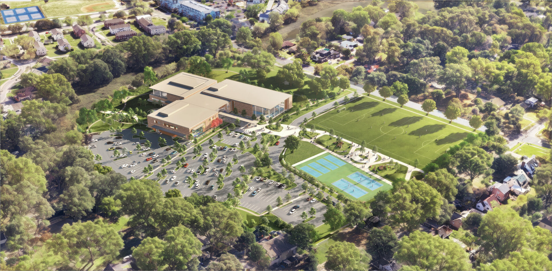 At approximately 107,000 square feet, the building will ease the transition from its residential surroundings by dividing into three smaller masses: the library, gym, and natatorium. The primary exterior materials will be brick, linear metal panels that mimic wood planks, and glass — all materials found within and familiar to the surrounding community. Large expanses of glazing will create connections between interior program elements and exterior amenities to allow views from the community into the building, highlight views to the surrounding natural environment, and provide natural daylighting into each space.