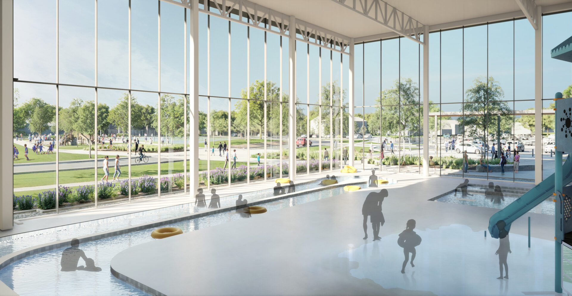 Upon entering the library, visitors will find adult, young adult, and juvenile stack spaces along with a kid zone, reading rooms, a sewing lab, and small meeting rooms, on the first floor. The second floor offers collaborative study spaces, a computer lab, a game room with multiple TVs and gaming consoles, and office space for library and city-wide Parks and Recreation staff with a staff terrace providing views of the wetlands. On the south side of the facility will be the gym, which will have a large basketball court that can be divided into two smaller basketball courts, volleyball courts, or pickleball courts. A weight room will also be on the first floor, with additional fitness spaces, such as a track, on the second floor. At the natatorium, bleacher seats will overlook the eight-lane competition pool and two 1-meter diving boards intended for community exercise and local team use. Both the competition pool and a therapy pool will feature zero-entry ramps for accessibility. Additional amenities will include men’s and women’s saunas, a pool party room, a pool classroom, and a lazy river and splash pad with water slides, which will add alternative opportunities for fitness and play.