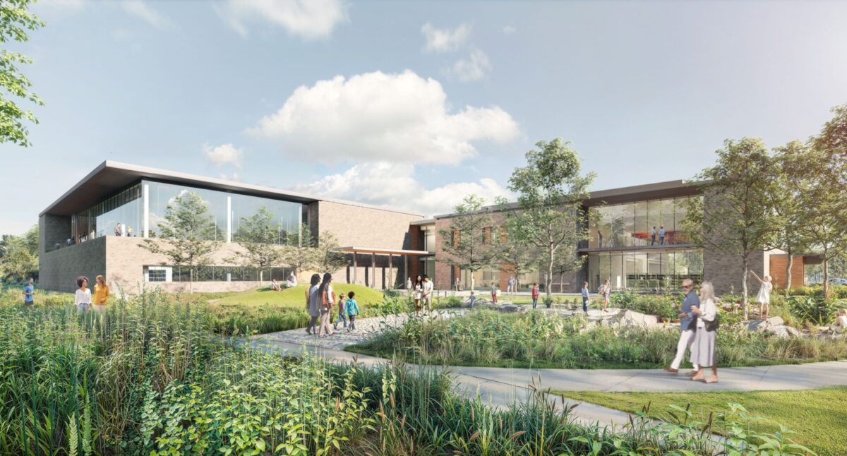 Embedded in the Wards Corner neighborhood, the facility’s exterior amenities will have two tennis courts, four pickleball courts, and a multipurpose field that will border the site and engage the surrounding community. A central plaza featuring a picnic area and two playgrounds will extend from the building entrance to North Shore Road. Additionally, a walking trail will circumvent the site and provide fitness metrics and educational signage. Near the library, visitors will find a quiet and introspective space adjacent to the wetlands. Featuring an outdoor classroom, meeting space, reading areas, and nature explorium, guests will have a wide range of opportunities to learn and connect with the natural beauty of the area.