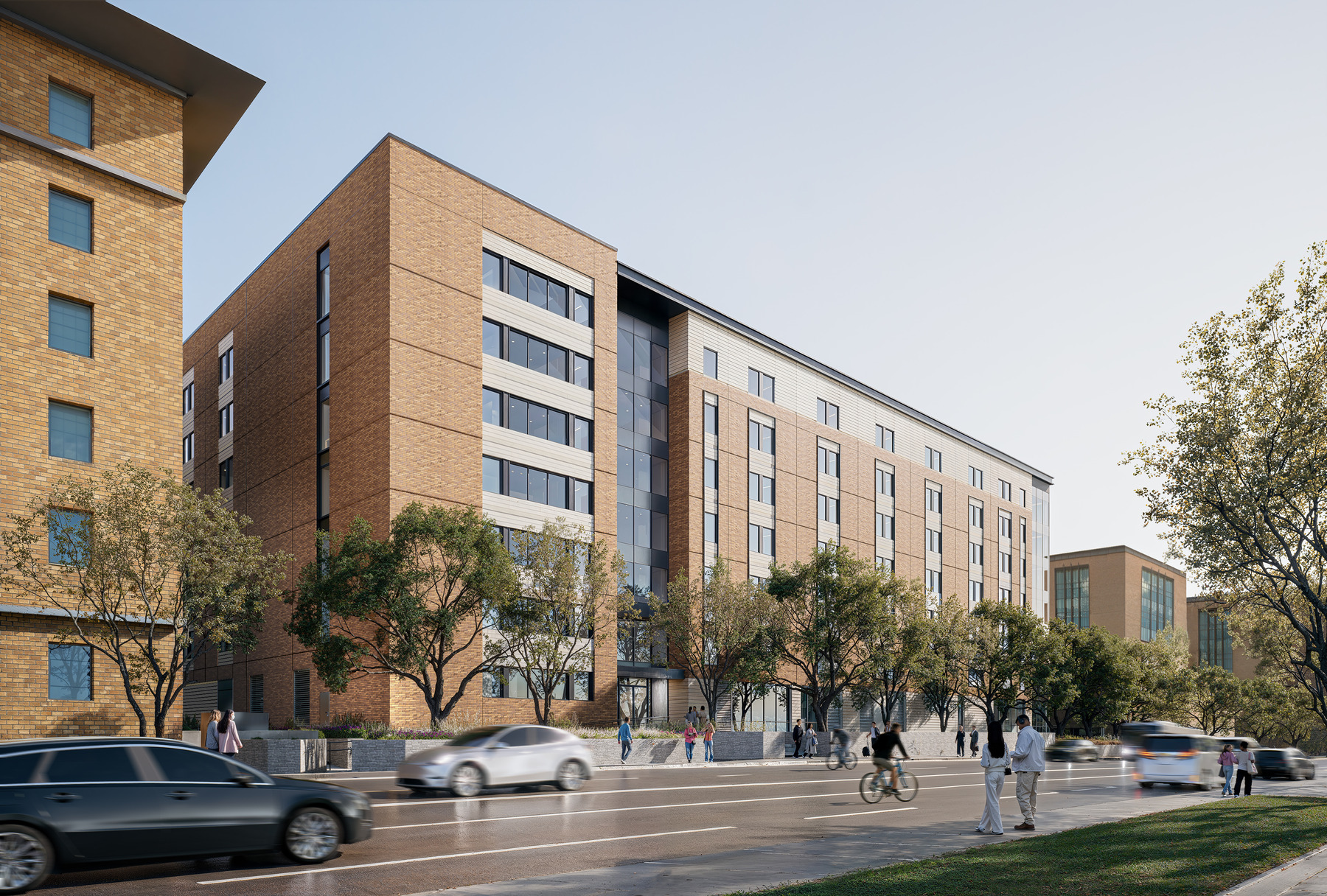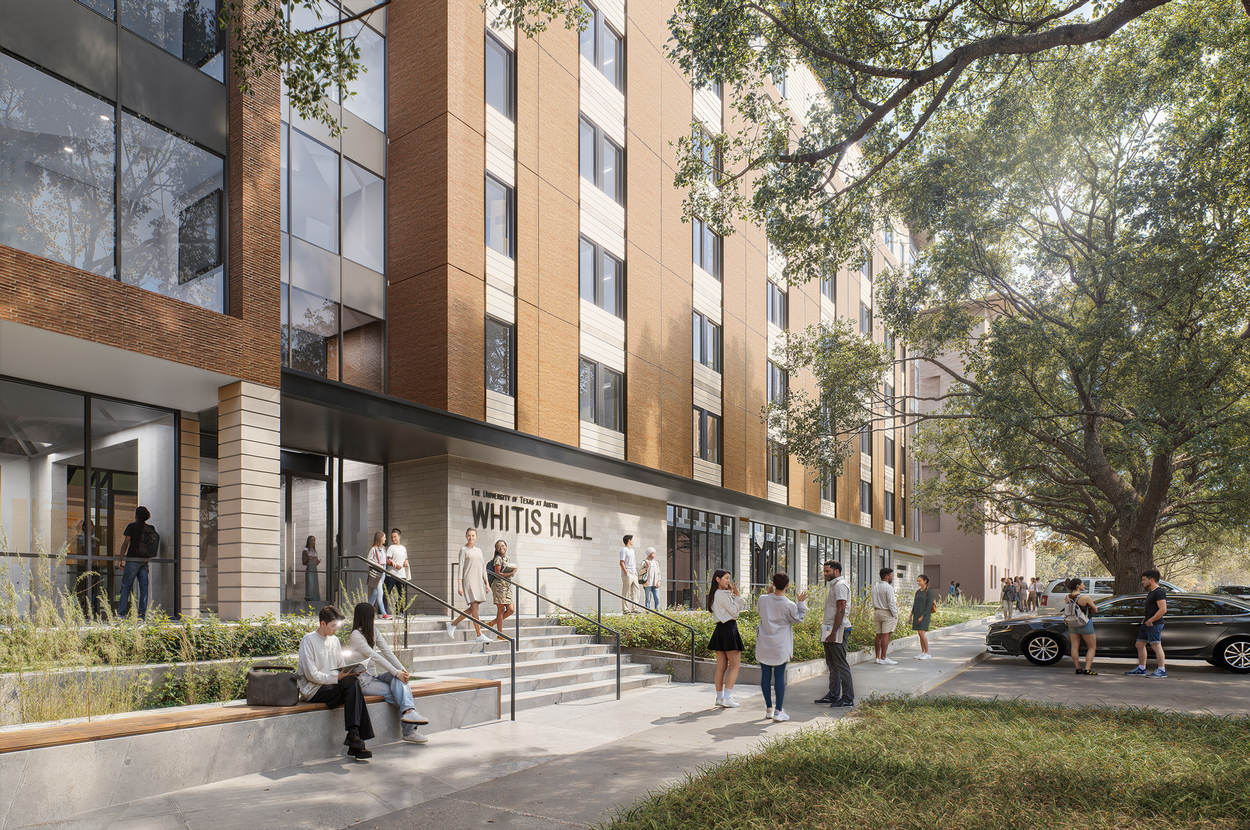 To be completed in 2027, the new Whitis Court residence hall is part of the university’s initiative to bring students back to campus and address the gap in affordable student housing. Compared to off-campus options, the on-campus housing will offer unique on-site amenities, proximity to academic facilities, and increased security measures. A reflection of UT Austin’s commitment to its student experience, the new residence hall will also aid undergraduates in finding their campus community through its intentional design, welcoming them as they step out of comfort zones and into an exciting new chapter.
