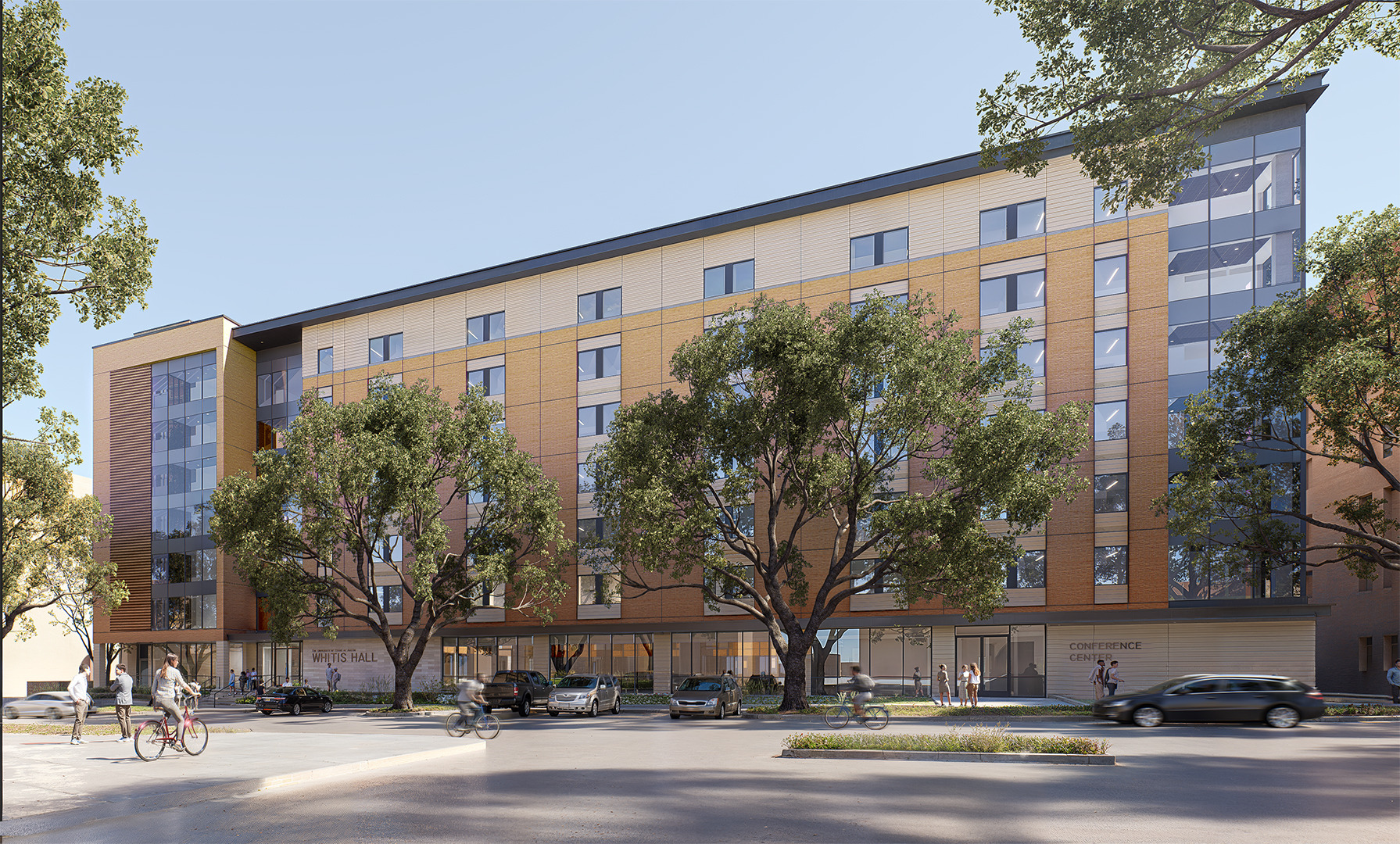 Adjacent to “The Drag,” a vibrant area with shops, restaurants, and art along the western edge of campus, the new Whitis Court Residence Hall will feature numerous amenities, from a gaming lounge inviting student interaction to phone booths offering moments of privacy that dorm-style accommodations can lack. The first floor will also house meeting and study spaces, active and passive lounges, a large kitchen, campus housing offices, and more. The upper floors will have traditional double occupancy rooms.