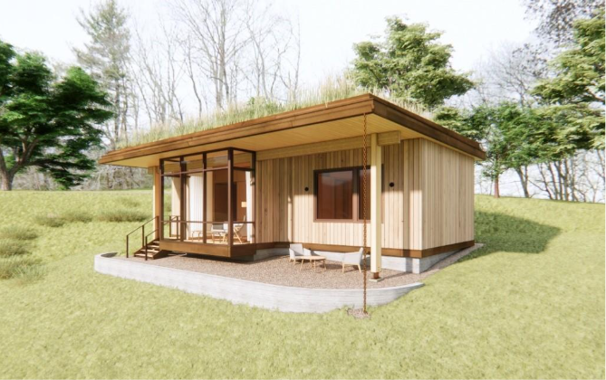 A wellness and educational campus in the mountains of Western North Carolina is expanding, and part of this expansion will include the construction of 30 identical cabins for temporary guest lodging. These cabins will be served by a new geothermal system on-site, comprised of two vertical distribution well-fields. The cabin itself is a one-bedroom, one–bathroom residential unit with a small living area, mechanical closet, entry hall, covered outdoor patio area, and a green roof.