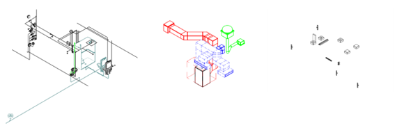 Isolated models of the cabin’s plumbing (left), mechanical (middle), and electrical (right) systems.