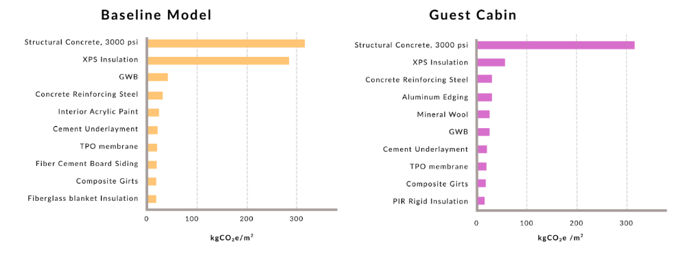 As detailed in Figure 1.1, below, compared to the baseline building, the cabin demonstrated a 73% reduction in embodied carbon, largely due to intentional material decisions made by the design team. Using wood as the main structural and finish material and mineral wool as the exterior wall insulation proved to be large contributors to this reduction value. Selecting local manufacturers for timber products and concrete also reduced the carbon associated with the transportation stage. The cabin even surpasses the International Living Futures Institute’s (ILFI) Zero Carbon Certification benchmark, described in ILFI’s “Zero Carbon Certification Overview,” by 50%. The cabin’s top 10 materials by GWP are shown below, clearly showing that the structural concrete used for the foundation is the most carbon-intensive material in the project.