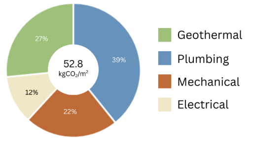 As shown in Figure 1.2, above, the embodied carbon of the cabin’s MEP systems was largely dominated by plumbing due to the use of cast-iron pipes. The geothermal system, which supplies heating and cooling to all 30 cabins, includes vertical piping for the well field, horizontal piping for distribution, 20% glycol solution, silica sand, and bentonite grout. The total geothermal embodied carbon was normalized to reflect its impact for one cabin.