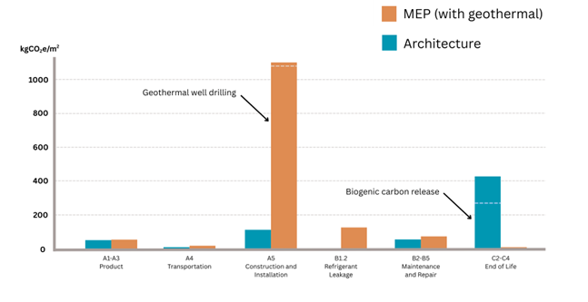 Drilling for the geothermal wellfield far outweighs the carbon associated with any other stage of the building’s life, so it may be worth looking into alternative fuel types, more efficient equipment or different well field locations.